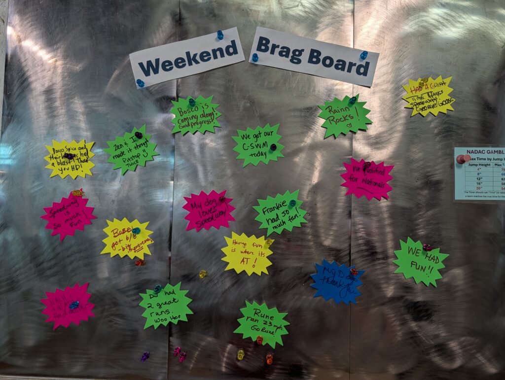 We had a great group of teams out for SpeedWay fun September 20-21, 2025. Anna Potter introduced us to an original SpeedWay Theme Song created by her son, and that got us all revved up and ready to race! Many teams got all the qualifying runs they needed to enter the 2026 CPE SpeedWay Nationals, and many new dogs got their first opportunity in a real trial experience! Our Brag Board says it all!
